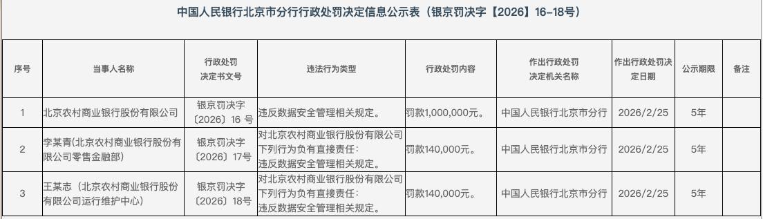 2月28日,中国人民银行北京市分行公布的行政处罚决定信息显示,北京农村商业银行股份有限公司(下称“北京农商银行”)因违反数据安全管理相关规定被罚款100万元。与此同时,该行零售金融部李某青、运行维护中心王某志因负有直接责任,分别被罚款14万元。